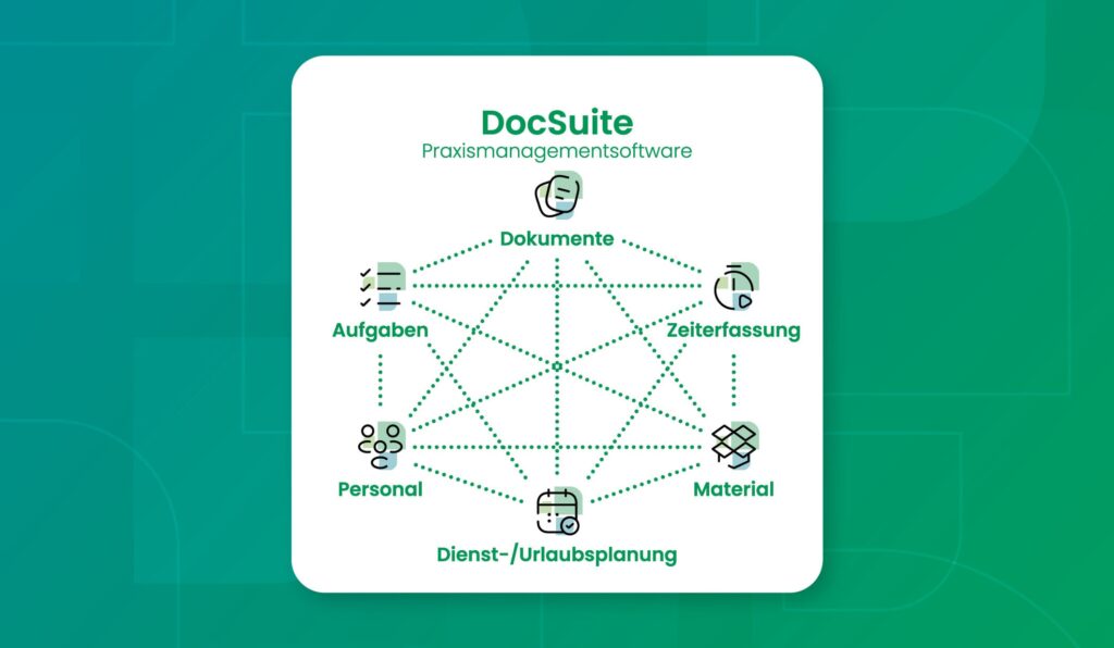 Die Praxismanagementsoftware DocSuite verbindet Praxisverwaltung und Praxisorganisation in einer übersichtlichen Anwendung mit integrierter Zeiterfassung und Urlaubsplanung und vereinfacht alle patientenfernen Prozesse. Die Software beschleunigt und optimiert die Verwaltung und Verteilung von Informationen. Das Ergebnis: bessere Kommunikation, eindeutige Zuständigkeiten, revisionssichere Archivierung und bis zu 10-mal schnelleres Auffinden von Informationen.